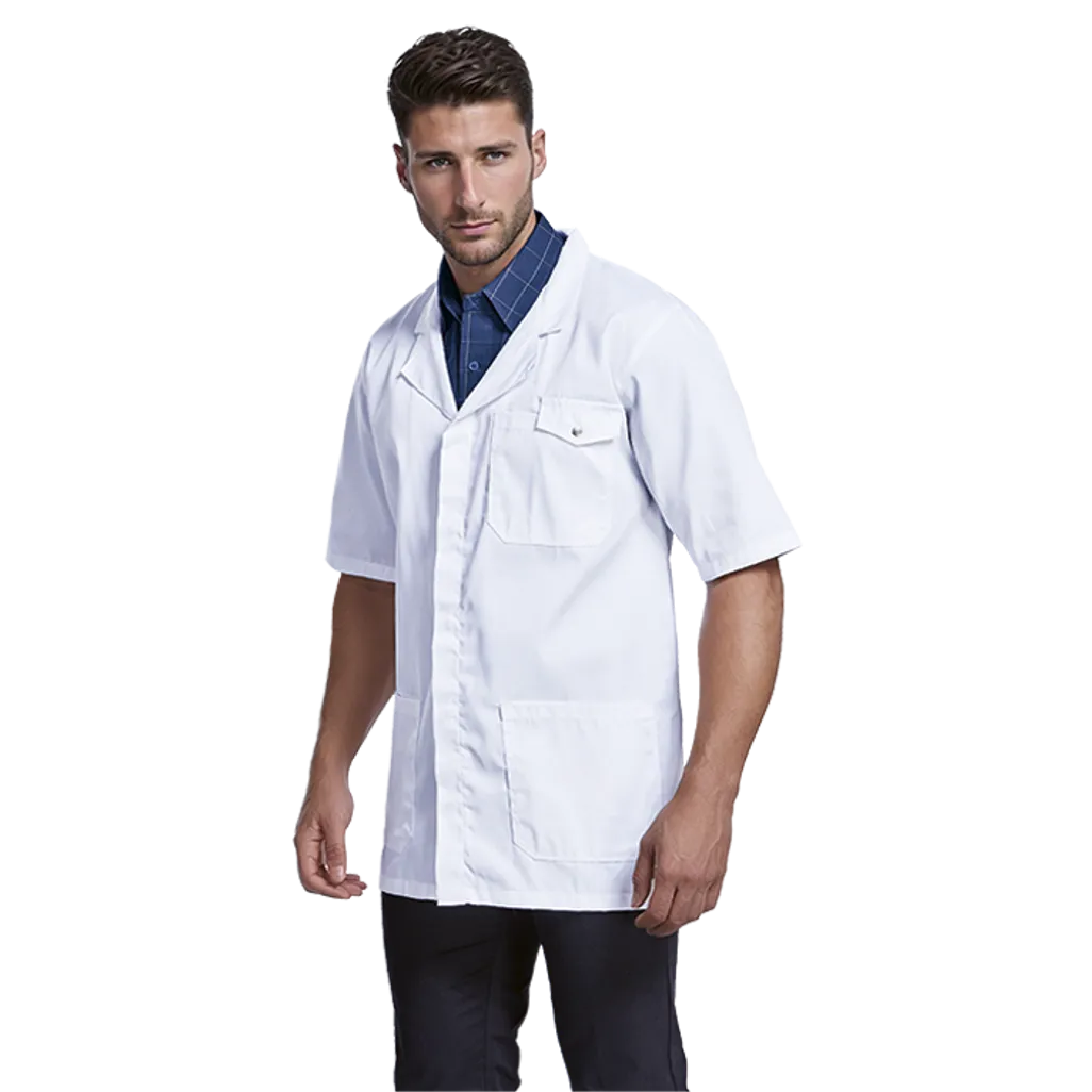 ISO, LOCAL, Back hem vent, Unisex lab coat, One piece collar, Front pockets at hem, Proudly South African, 210g, Poly Cotton fabric, Perfect for any profession, Available in long and short sleeves, Chest pocket with pen slot and flap, Concealed front opening with press studs, Due to the nature of this product, there could be colour shade variances which cannot be controlled
